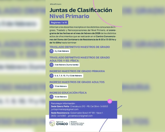 El Ministerio de Educación, a través de las Juntas de Clasificación de Nivel Primario, con sedes en Presidencia Roque Sáenz Peña y Resistencia-que abarcan a todas las Regiones Educativas de la provincia- informa a los docentes inscriptos en los concursos de Ingreso, Traslado y Reincorporaciones del Nivel Primario el cronograma de los actos de ofrecimiento de cargos correspondientes al mes de febrero de 2026.