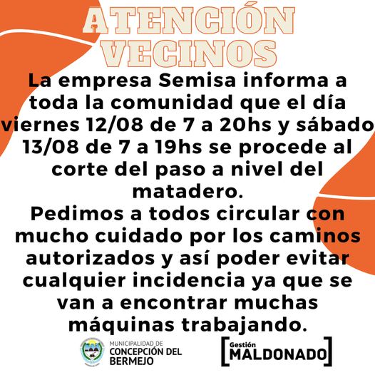 La empresa Semisa hace saber a la comunidad que el día viernes 12/08 de 7 a 20hs y sábado 13/08 de 7 a 19hs se procederá al corte del paso a nivel del matadero, es decir no se va a poder ingresar ni egresar, pero se podrá tomar el camino alternativo (camino de piedras del costado interno de las vías, es decir el camino del basural propiamente dicho).