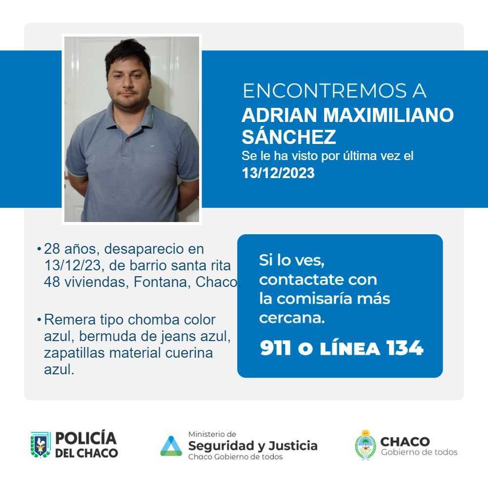 La Policía del Chaco, en base a una denuncia registrada en Comisaría Primera Fontana, solicita a la comunidad información relacionada al paradero de Adrián Maximiliano Sánchez, de 28 años, 1,70 metros de altura, contextura física robusta, tez blanca, cabello lacio negro.
