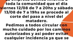 La empresa Semisa hace saber a la comunidad que el día viernes 12/08 de 7 a 20hs y sábado 13/08 de 7 a 19hs se procederá al corte del paso…