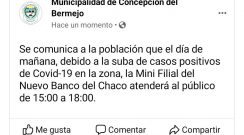 El municipio de Concepción del Bermejo informa 36 casos positivos en la localidad.