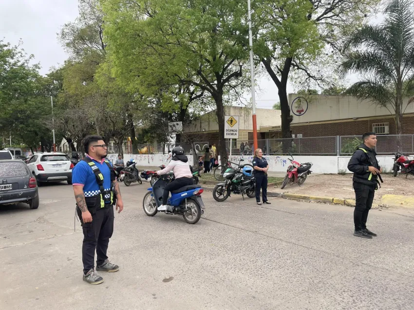 Inspectores de tránsito se ubicaron en la intersección de avenida Alvear y Cangallo, a la salida del Jardín de Infantes N°1 Merceditas de San Martín, y en la esquina de calles Mendoza y Cangallo, en el acceso principal de la Escuela Provincial N°54 Ejército Argentino.
