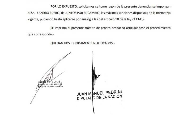 En una nota presentada ante las autoridades del Tribunal Electoral de la provincia, los diputados expresaron que, “como pudo observarse claramente, siendo además de público y notorio conocimiento”, el candidato a gobernador “incumplidor del reglamento”, durante el uso de la palabra y mientras hacía alusión a una “serie de falacias de una supuesta afiliación de la fallecida madre” del actual gobernador Jorge Capitanich, «blandía exhibiendo ante las cámaras un impreso de una fake news (sin revelar fuente o referencia periodística), cuyo título leía al aire y decía textualmente ‘Escándalo en Chaco con la afiliación trucha de la madre de Capitanich'», expresaron.