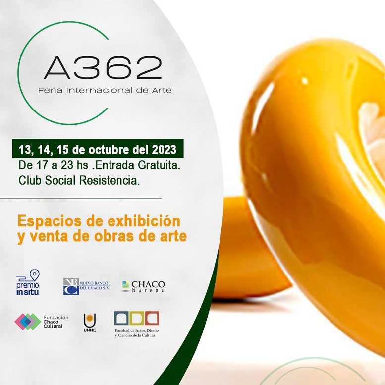 Del 13 al 15 de octubre, Resistencia será sede de la A362 Feria de Arte en el Club Social. La entrada será libre y gratuita, y la muestra permanecerá abierta de 17 a 23. La feria se constituye con la proyección de ser un espacio de exhibición, comercialización y divulgación de las diversas prácticas visuales, para estimular lazos entre el público, estudiantes, artistas, curadores, gestores, galerías y coleccionistas de diferentes regiones del país.