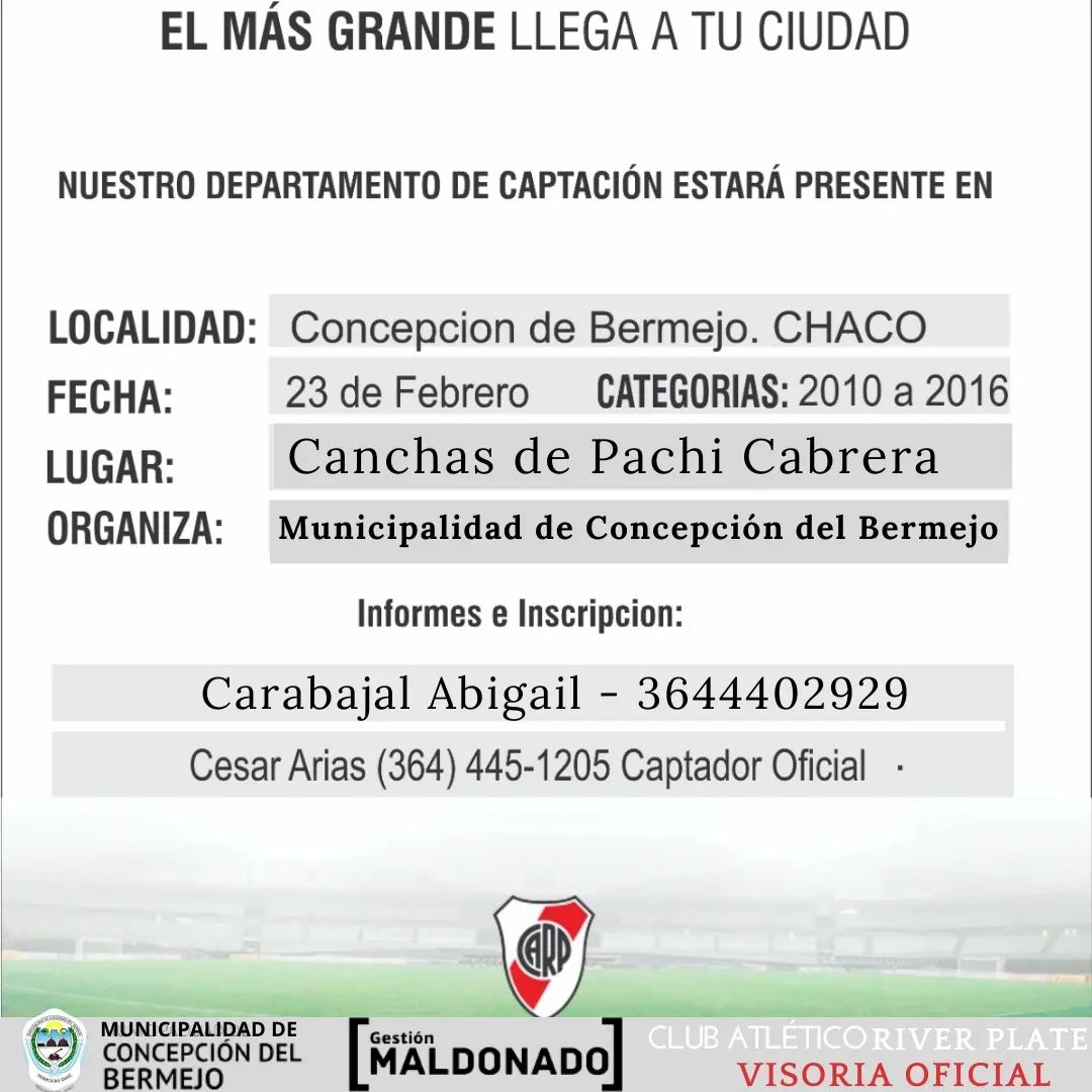 Mañana Jueves 23 de Febrero, llega a la localidad de Concepción del Bermejo el Departamento de Captación del Club River Plate.