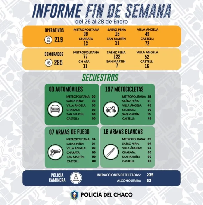 Durante el viernes a la noche y domingo, se realizaron 219 operativos de seguridad en toda la provincia, donde secuestraron 197 motocicletas de las cuales 13 eran buscadas por la justicia, siete armas de fuego, 16 armas blancas y demoraron a 285 personas.