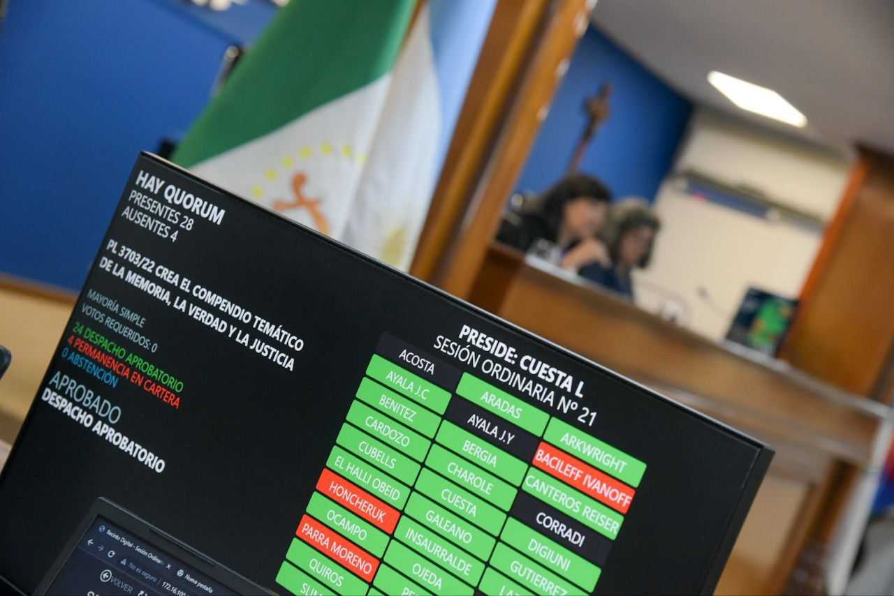 En primer lugar, se sancionó la Ley que crea el Compendio Temático de la Memoria, la Verdad y la Justicia, impulsada por la diputada Teresa Cubells junto al diputado Juan Carlos Ayala, como un mecanismo tendiente a recopilar, ordenar y clasificar por temáticas la legislación vigente en materia de Derechos Humanos, incluyendo leyes nacionales, provinciales, decretos reglamentarios de la Provincia y jurisprudencia de carácter nacional y provincial y convenciones internacionales.