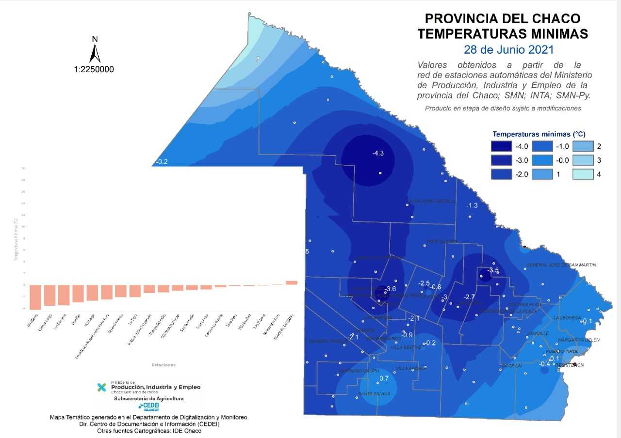 En tanto, en el Este provincial (zona que incluye a Resistencia), la temperatura fue de 0,1ºC; mientras que en Santa Sylvina los 0,7ºC significaron el regustro más alto durante la madrugada de hoy. El mapa que se publica fue elaborado por el Departamento de Digitalización y Monitoreo de la Dirección Centro de Documentación e Información (CEDEI).