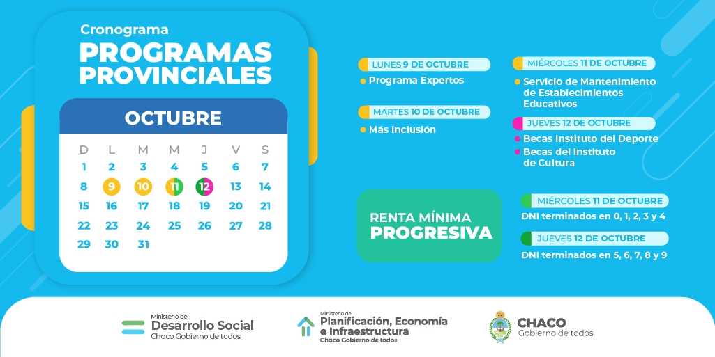 Renta Mínima Progresiva: miércoles 11 de octubre (DNI terminados en 0, 1, 2, 3 y 4); jueves 12 de octubre (DNI terminados en 5, 6, 7, 8 y 9).