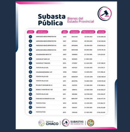 El Gobierno del Chaco, a través de la Secretaría General que conduce Carolina Meiriño, informó la realización de una subasta pública de 36 vehículos oficiales, una iniciativa que busca optimizar el uso de los bienes del Estado y generar nuevas oportunidades para la comunidad.