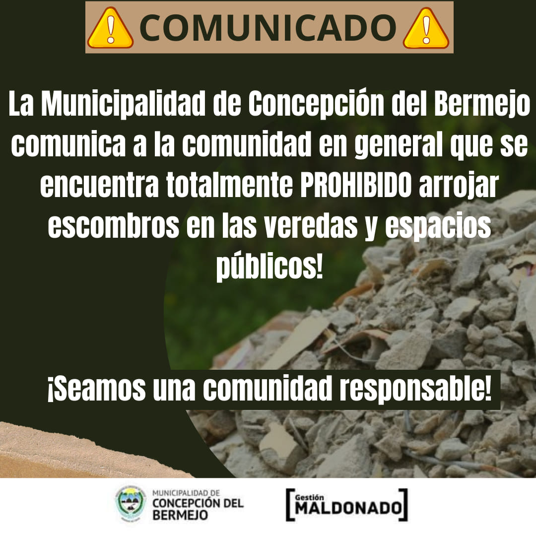 El municipio de Concepción del Bermejo recuerda nuevamente que está totalmente prohibido arrojar escombros y cualquier otro tipo de residuos/elementos que obstruyan la libre circulación de los vecinos.
