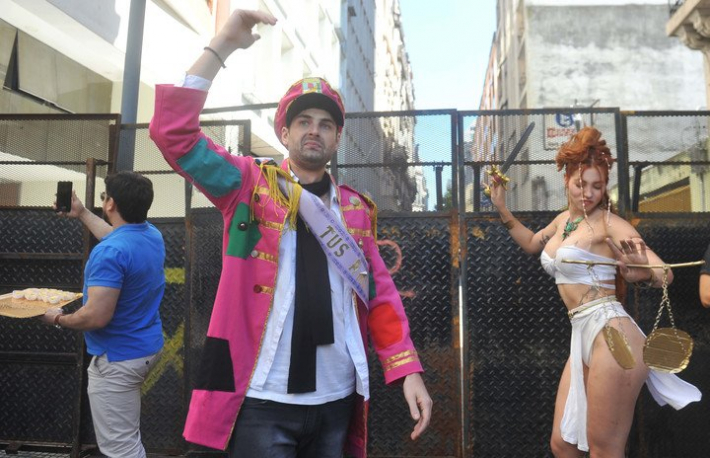 En las afueras de tribunales, El Presto realizó una perfomance a modo de queja por el proceso. Llegó con un saco rosa y acompañado de dos mujeres que simulaban ser Temis, la diosa de la Justicia.