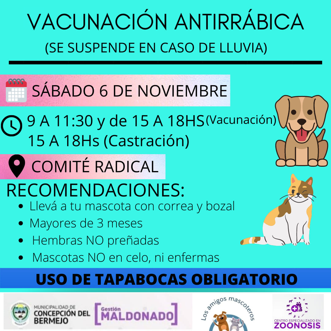 Este sábado 6 de Noviembre se llevará a cabo la primera vacunación antirrábica gratuita en la localidad Concepción del Bermejo; la jornada tendrá lugar en Comité Radical desde las 9 a 11:30 hs y por la tarde de 15:00 a 18:00 horas, por otra parte, se realizarán castraciones a bajo costo organizada por «Los Amigos Mascoteros».