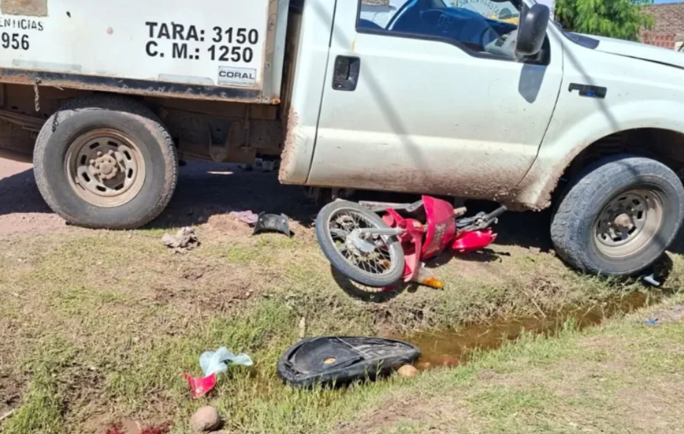 Al llegar, los agentes confirmaron la colisión entre un camión Ford Duti 2005, conducido por un hombre de 50 años, empleado de un comercio local, quien resultó ileso; y una motocicleta Appia City Plus 110 cc, en la que se desplazaban dos mujeres que fueron trasladadas de urgencia, antes del arribo de la prevención.
