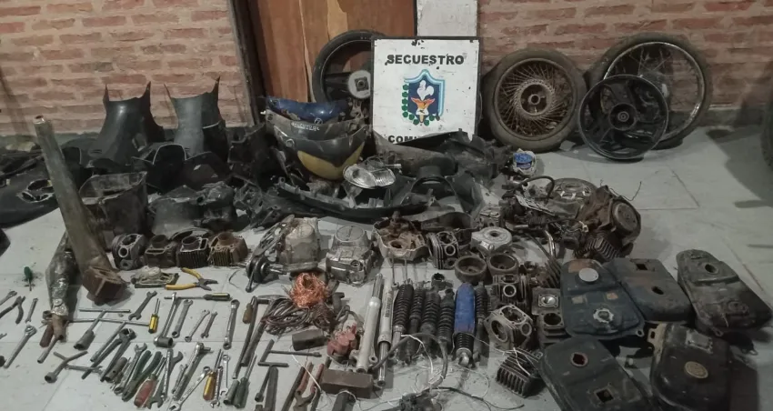 Tras los procedimientos, se secuestraron dos motos de dudosa procedencia, varias partes de motos como amortiguadores y carenados, una notebook, diez celulares, cascos, una llave «T» de fabricación casera, un motor completo, entre otros.