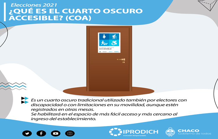 Dentro del procedimiento de accesibilidad electoral también se contempla que cada establecimiento de votación debe contar con un Cuarto Oscuro Accesible (COA) destinado al sufragio de personas con discapacidad o limitaciones, como así también a adultos mayores y mujeres embarazadas y/o con niños. El COA debe atenerse a las siguientes características: