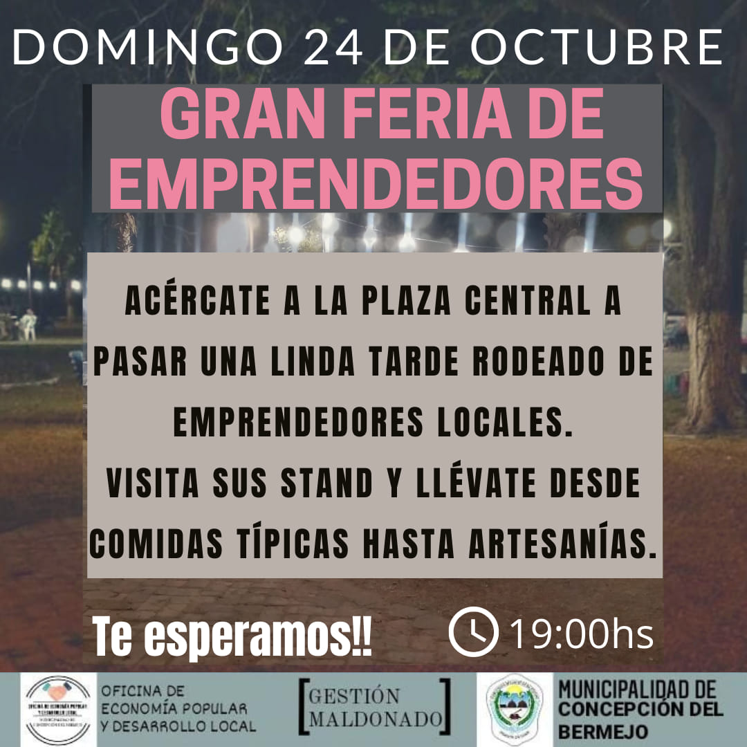 Este domingo 24 de Octubre invitan a toda la comunidad a participar de un nuevo encuentro de esta Gran Feria de Emprendedores, la misma se llevará a cabo en la Plaza Central, desde las 19hs.