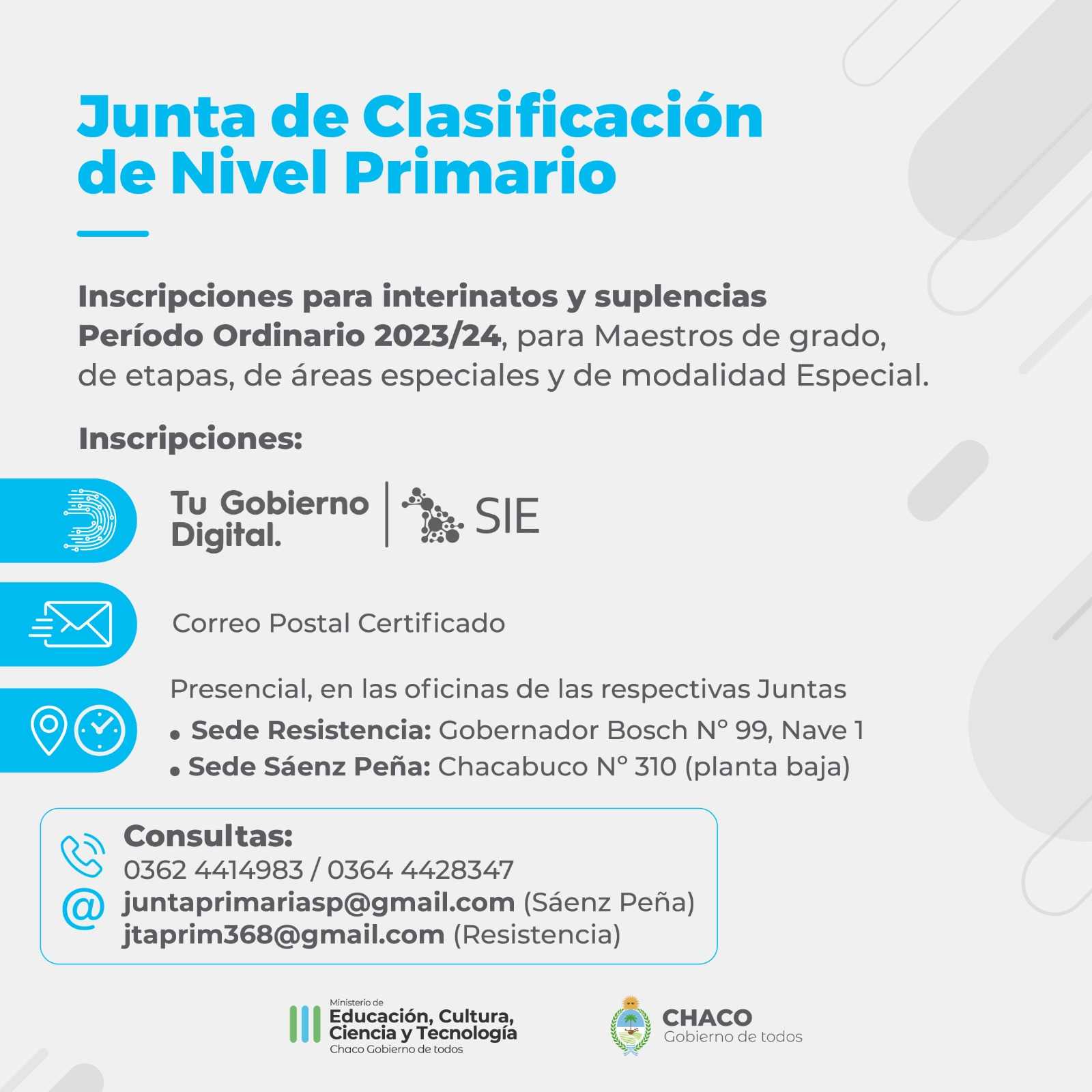 Para mayor información, podrán comunicarse a los teléfonos 0362 4414983 o al 0364 4428347, o a los mails oficiales de las Juntas: juntaprimariasp@gmail.com (Junta Sáenz Peña) y jtaprim368@gmail.com (Junta Resistencia)