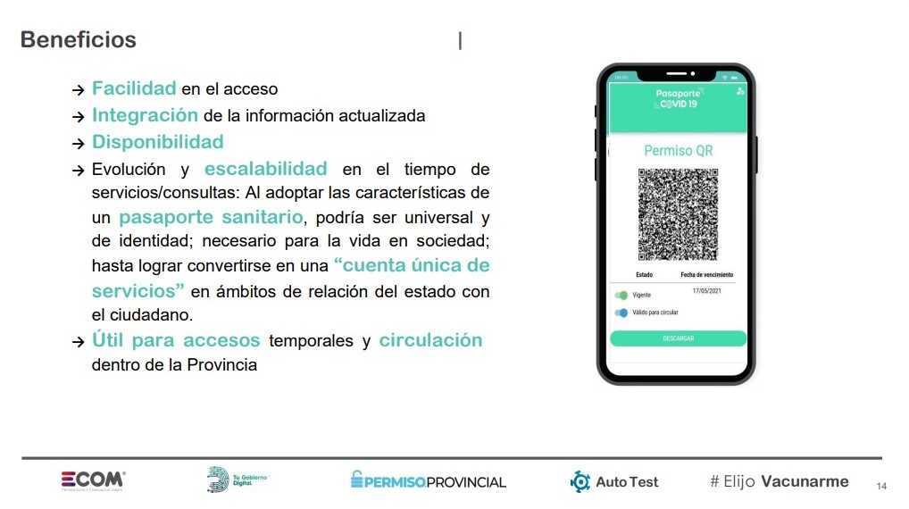 Toda la información estará resumida en un código QR. Esta herramienta está diseñada para trabajar sobre una arquitectura de micro servicios, aprovechando las aplicaciones ya existentes de Permiso Provincial, Auto Test, Elijo Vacunarme y Consultas de Resultados COVID.