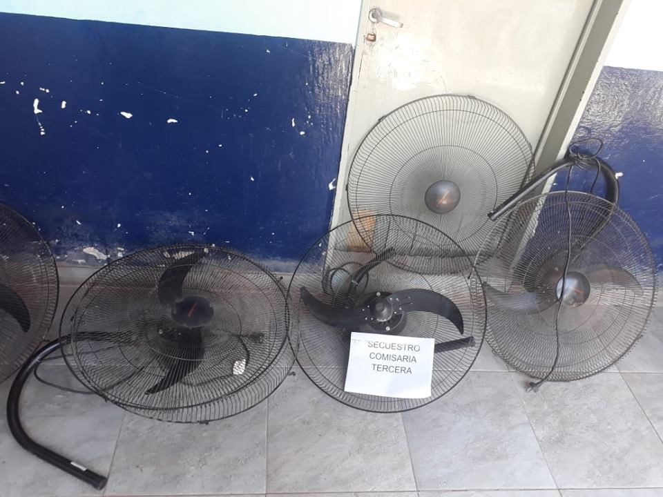 Tras rastrillaje a pie, la policía logró secuestrar 5 ventiladores industriales marca STANDART ELECTRIC, 26” pulgadas.