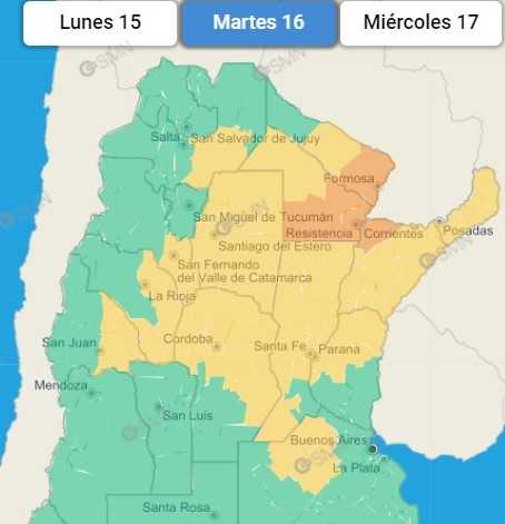 En tanto, hacia el norte provincial se mantiene el alerta amarillo, que indica que el área será afectada por tormentas de variada intensidad, algunas fuertes, pudiendo estar acompañadas por intensas ráfagas, muy fuerte actividad eléctrica, ocasional caída de granizo y fundamentalmente abundante caída de agua en cortos períodos. Se esperan valores de precipitación acumulada entre 30 y 60 mm, pudiendo ser superados de forma puntual.
