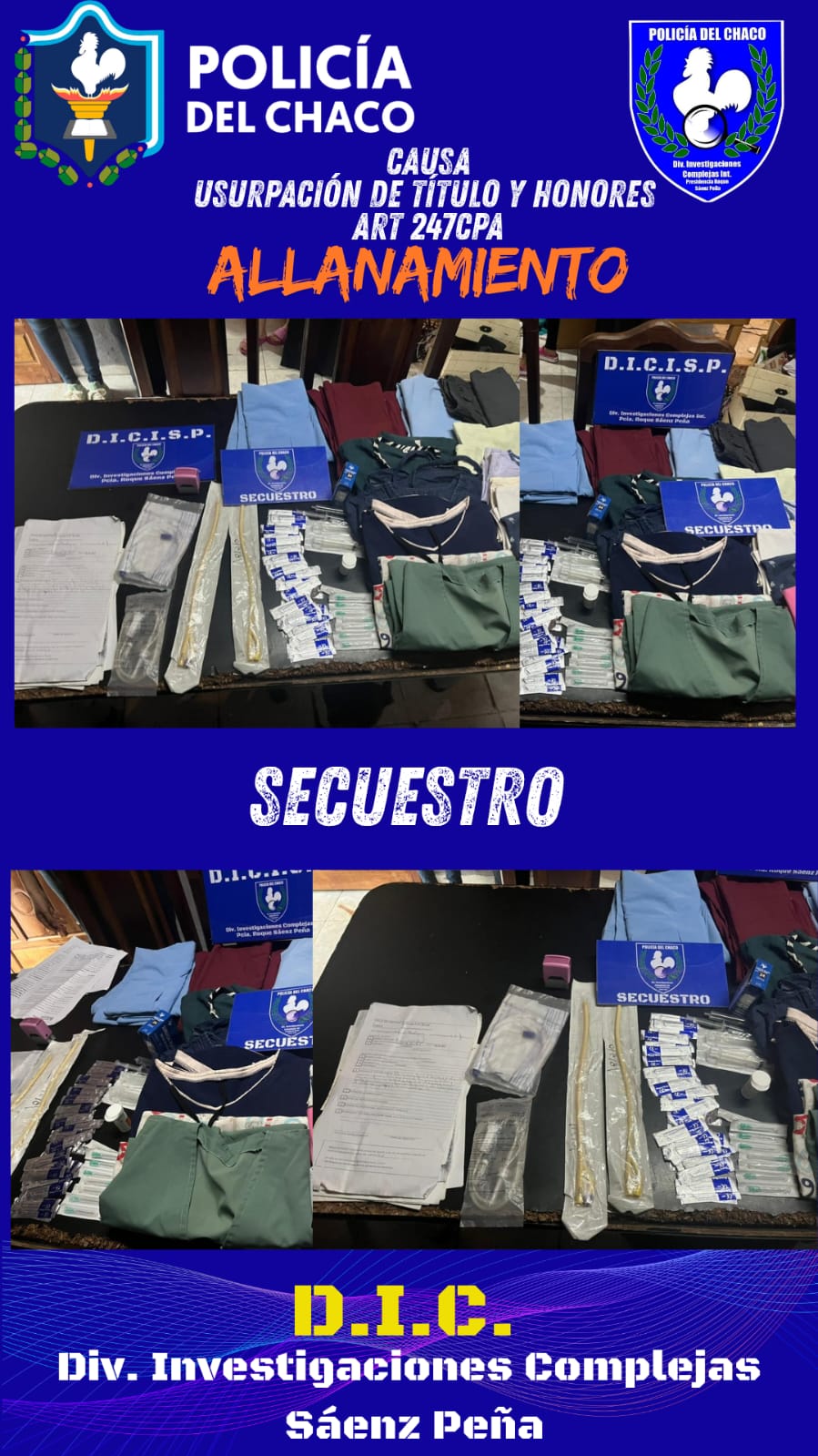 Personal de la División Investigaciones Complejas del Interior de Sáenz Peña realizó este viernes un allanamiento en una vivienda del barrio San Cayetano de Saenz Peña, en el marco de una causa por “Supuesta Usurpación de Título y Honores”, prevista en el artículo 247° del Código Penal Argentino.