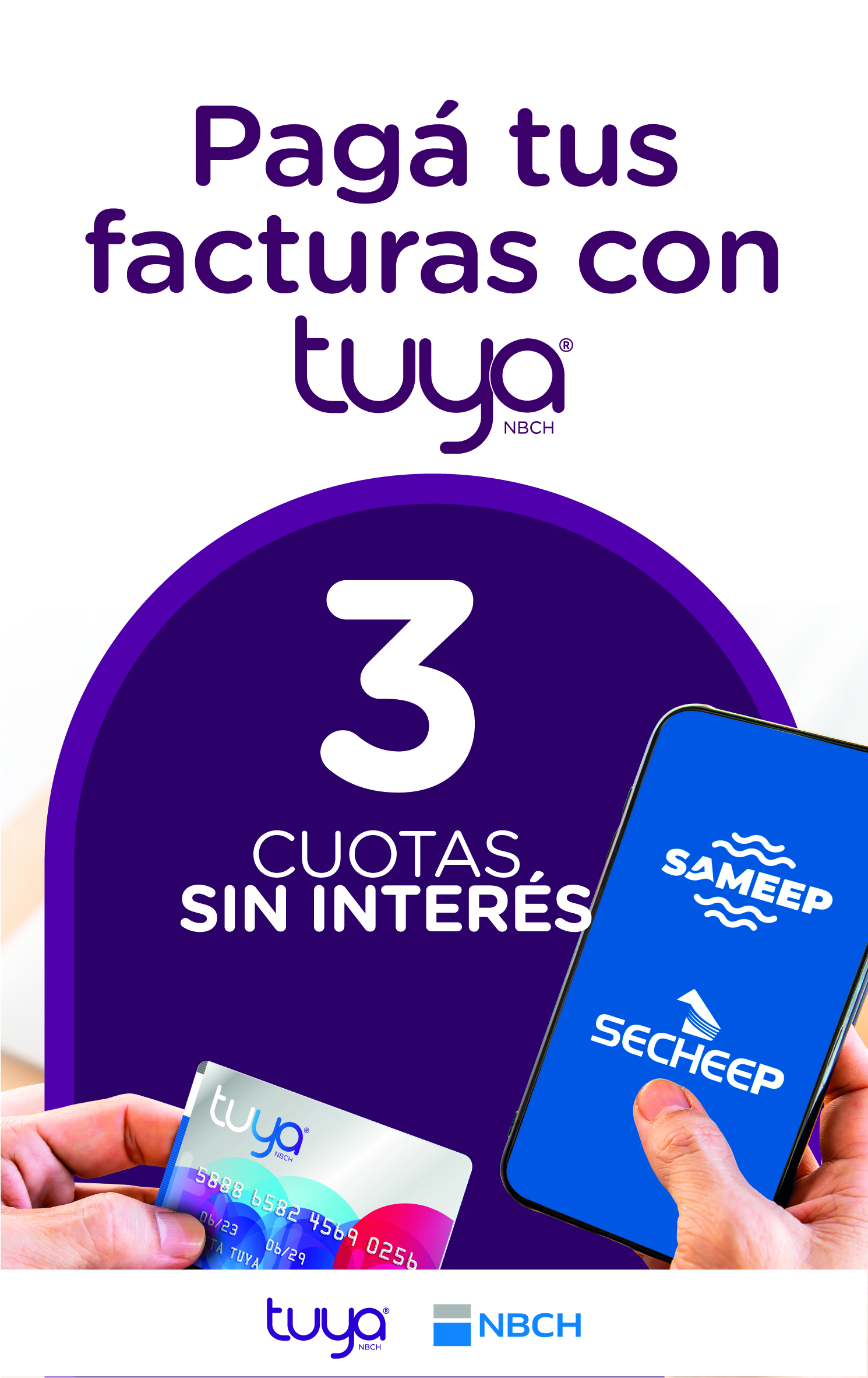 El Nuevo Banco del Chaco recordó las opciones de pago y financiamientos disponibles para abonar las boletas de agua y de luz en 3 cuotas sin interés con tarjeta Tuya, a través de las plataformas digitales y en las oficinas presenciales de Sameep y Secheep. Con tarjeta Tuya los pagos pueden ser financiados en 3 cuotas sin interés o 5 y 9 cuotas fijas con un costo financiero mínimo.