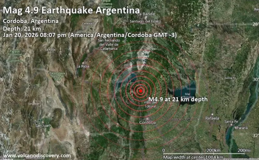 Un sismo de magnitud 4,4 en la escala de Richter se registró este martes por la noche en la provincia de Córdoba y fue percibido en numerosas localidades , especialmente en el norte provincial. El movimiento telúrico ocurrió a las 20:07 y tuvo su epicentro en el departamento de Ischilín, al noroeste de la capital cordobesa.