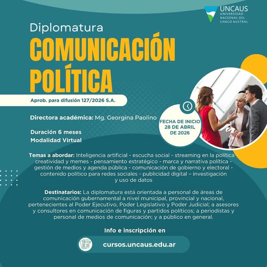 La Universidad Nacional del Chaco Austral presenta una nueva propuesta académica de alto nivel: la Diplomatura en Comunicación Política, una formación integral orientada a quienes buscan comprender y dominar las dinámicas actuales de la comunicación en el ámbito político y digital.