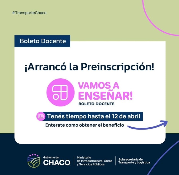 El gobierno provincial reabrió las preinscripciones para “Vamos a Enseñar”. A través de las redes sociales de la Subsecretaría de Transporte y Logística del Chaco se convoca a docentes que viven en una localidad diferente de la que trabaja, a sumarse a la propuesta de boletos gratuitos ida y vuelta. Hay tiempo desde hoy martes 12 de marzo y hasta el próximo 12 de abril.
