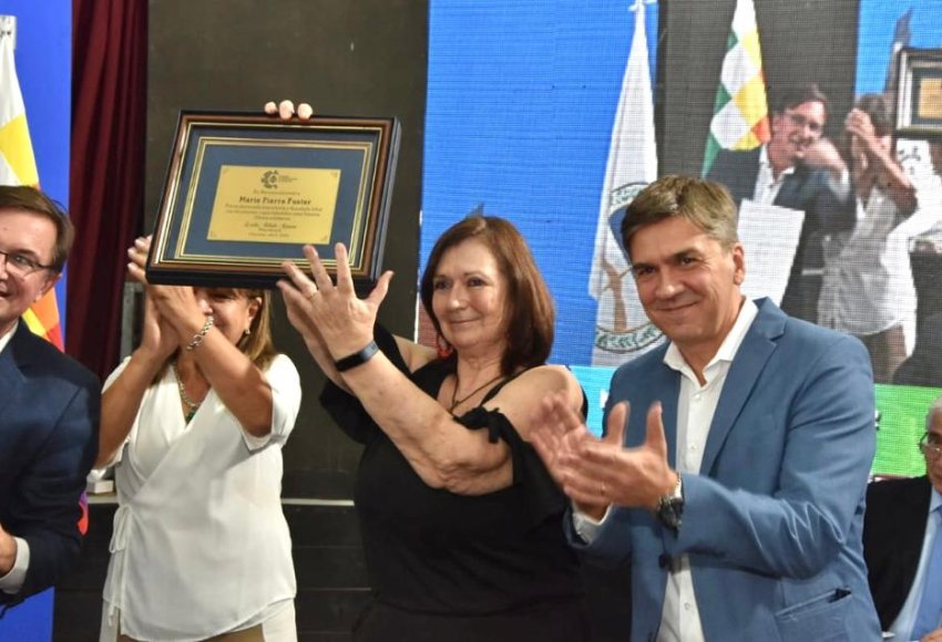 El diputado provincial Leandro Zdero junto a su par Livio Gutiérrez entregaron hoy un reconocimiento, durante la sesión itinerante de Charata, a la señora Marie Pierre Fuster, de nacionalidad francesa, por su extensa trayectoria y denodada labor en la comunidad charatense.